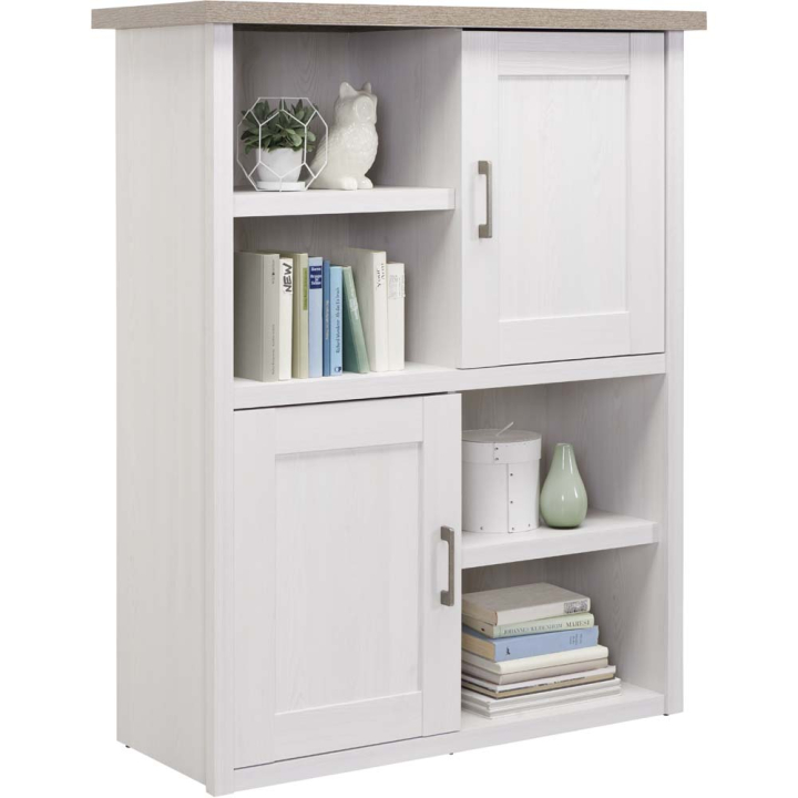 Етажерка с врати с размери на продукта Ш:106/Д:43/В:135 см. Предоставя възможност личните вещи на вашето дете да са деликатно подредени и надеждно съхранени. Състои се от плот удобен за поставянето и представянето на любими играчки, артефакти, както и четири самостоятелни отделения, две от които с врати на панти. На двата вътрешни рафта ще намерят място книгите и учебниците, неразделна част от всяко детство, удобно чакащи да бъдат прочетени. Декорацията на етажерката е повече от подходяща, като плотът в тъмен дървесен декор е стилно откроен от конструкцията и вратите декорирани с текстура на бял бор, естествена изразителна дървесна текстура, добавяща уют към помещението. Продуктът е произведен от висококачествено ПДЧ, със здрави и стабилни сглобки, които ще издържат във времето, и етажерката ще ви служи вярно дълги години.