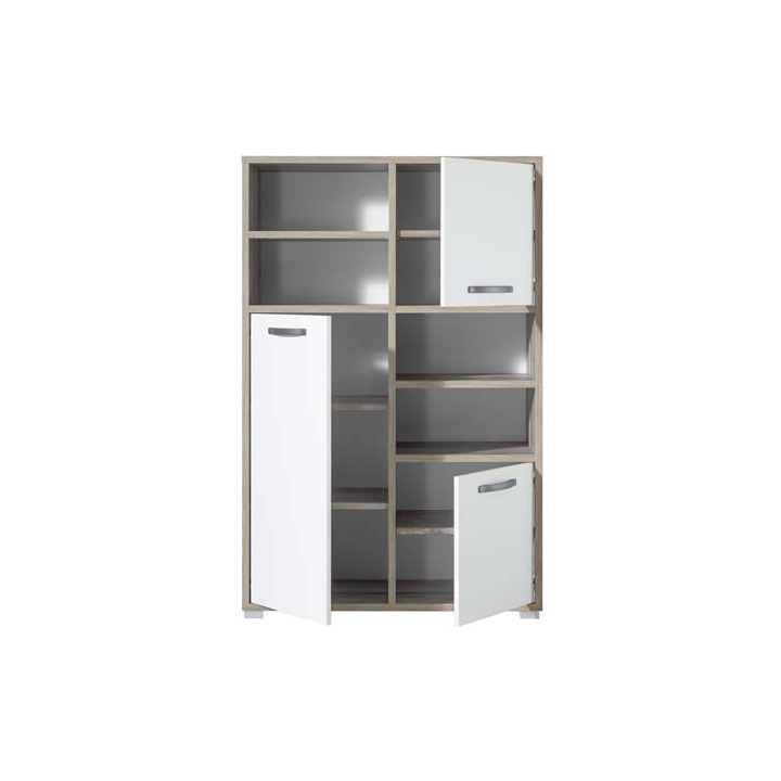 Нисък гардероб с размери Ш:95/Д:46/В:146 см. Практичен нисък гардероб с разпределение от три отделения с врати на панти, зад които са монтирани четири рафта, както и две отворени отделение с монтирани в по един рафт. Произведен е от ПДЧ с дъсчена текстура в няколко различни декора с ефект на състарено дърво и бяло.