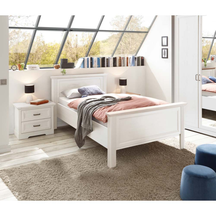 Дизайнерско легло с размери Ш:145/Д:215/В:98 см. Артикулът е моделиран за матрак с големина 120/200 см, като притежава красива форма с декоративна фрезовка. Разполага с горна и долна табла за приятен и комфортен сън, като със сигурност ще ви хареса цялостната визия на продукта. Леглото е здраво и стабилно произведено от ПДЧ, стилно декорирано в бял цвят, като позволява лесно и бързо почистване на пространството под него.