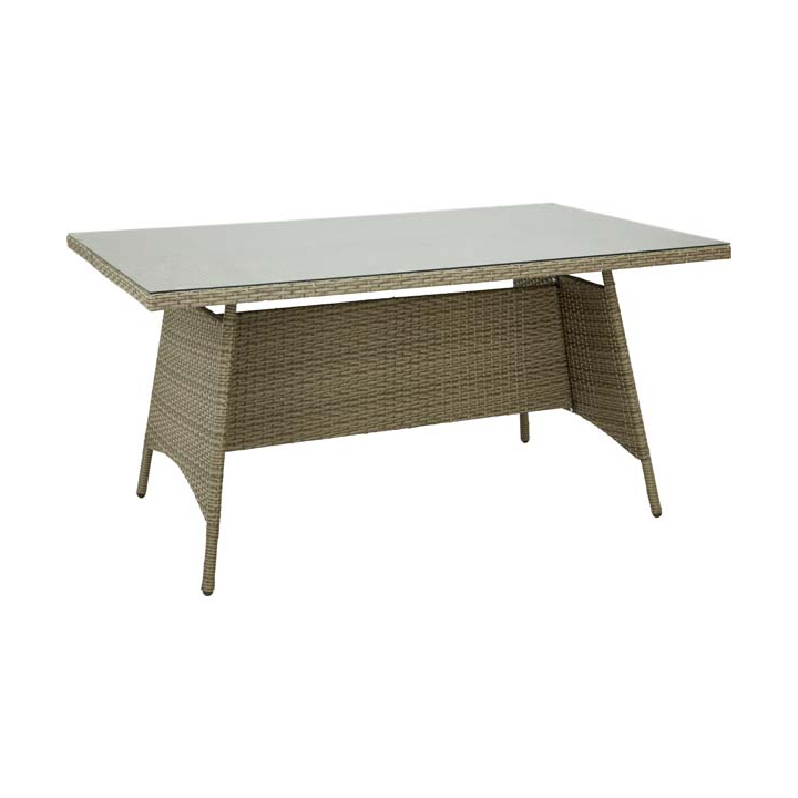 За привържениците на класически стил и традиционен цвят, тази елегантна трапезна маса ще бъде добър избор. Стоманената конструкция обещава дълготрайно ползване, а PVC ратанът в бежов цвят внася допълнителен чар в дизайна. Плотът е от темперирано стъкло с дебелина 5 мм, а размерът на масата е комфортно зададен - Шх90/Дх150/Вх72 см.