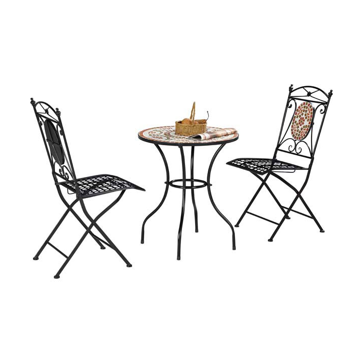 Мозаечната орнаментика приканва към заслужено отпускане на сетивата, а компактният размер на масата (Ф60/71 см) и сгъваемостта на столчетата - (Ш/Д/В) 35,9/49/89 см - предразполага към бърза и лесна промяна на местоположението в екстериора или към временно съхранение.
