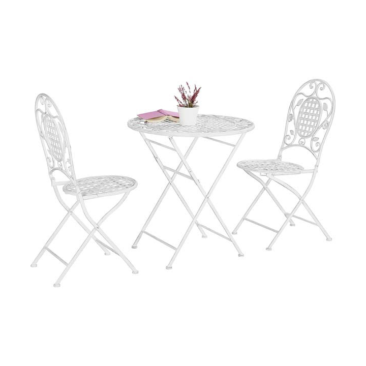 Изчистеният бял цвят на масата с диаметър Ф70/76 см и столчетата с размер (Ш/Д/В) 48/35,9/94,5 см провокира ведро усещане за свежест. Нежната орнаментика приканва към заслужено отпускане на сетивата, а компактният размер и сгъваемите механизми предразполагат към бърза и лесна промяна на местоположението в екстериора или към временно съхранение. Изключително лесен за поддръжка и почистване, с максимална издръжливост 40 кг на масичката и 110 кг на столчетата.