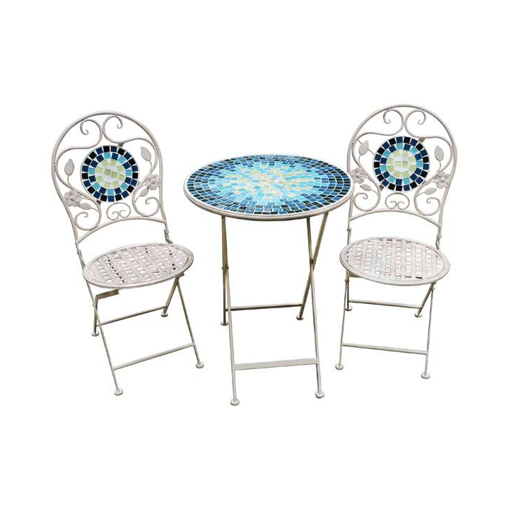Елегантно произведение на изкуството, предназначено за двора и терасата, с инкрустирана мозайка в цветни геометрични детайли, приятни ажурни извивки и изключителна здравина на материала. В същото време с устойчивост на атмосферни влияния и стабилност при ползване – 40 кг максимална товароносимост на масата и 120 кг на столчетата. В хармония с основата от бял цвят е постигнат нестандартен дизайн, чрез мозайка в синя гама с акцент в жълто. Невероятно усещане за красота и следобеден шик в компанията на цветни приказки и пъстри цветя. Мозаечната орнаментика приканва към заслужено отпускане на сетивата, а компактният размер и сгъваемостта на масата (Ф60/76 см) и столчетата (Ш/Д/В) - 41/40/94 см предразполага към бърза и лесна промяна на местоположението в екстериора или към временно съхранение. Изключително лесен за поддръжка и почистване.