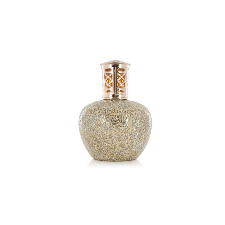 Тази ароматна лампа ще ви накара да се почувствате, сякаш току-що сте попаднали пред едно малко съкровище. Ярка, жълто-златиста, ръчно изработена от блестящи златни и сребърни огледални мозаечни парчета, допълнена с капачка от антично матирано злато. Стаята се изпълва с неустоим аромат, едновременно успокояващ, въздействащ релаксиращо на сетивата и пречистващ въздуха по неповторим начин.