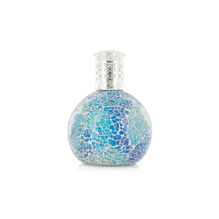 Приветливото сливане на синьо и зелено наподобява мини тропически риф, отвеждащ ви в подводно царство!Огледални и цветни мозаечни стъклени парчета покриват тази малка лампа с форма на кълбо, която е завършена със сребърна капачка с резба. Стаята се изпълва с неустоим аромат, едновременно успокояващ, въздействащ релаксиращо на сетивата и пречистващ въздуха по неповторим начин.