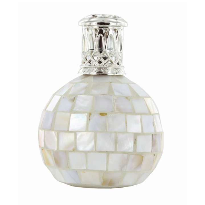 Бели мозаечни парчета със седефен отблясък покриват тази малка лампа с форма на кълбо, която е завършена със сребърна капачка с резба. Стаята се изпълва с неустоим аромат, едновременно успокояващ, въздействащ релаксиращо на сетивата и пречистващ въздуха по неповторим начин.