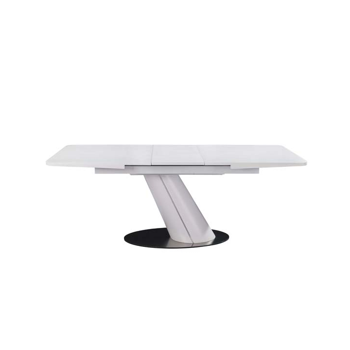 Модерна и стилна разтегателна трапезна маса с размери Ш:160-200/Д:90/В:76 см. Моделът ще ви очарова със своята съвременна и елегантна форма, както и функционалност. Плотът на масата е с 5 мм сатинирано бяло стъкло, на който може да бъдат настанени от 4 до 8 човека. Трапезната маса е произведена от MDF цялостно декорирана в бял мат, поставена на овална метална основа.