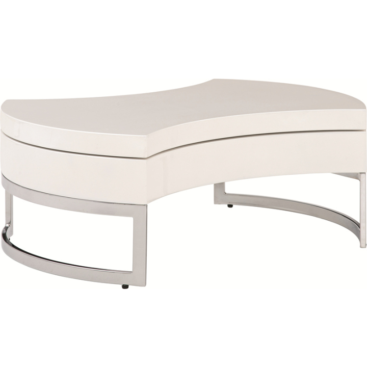 Дизайнерска холна маса с размери Ш:90/Д:90/В:35 см. Плотът и конструкцията на масата са произведен от MDF с луксозно бяло лаково покритие, поставени на два извити хромирани елемента (основи), с протектори щадящи пода. Конструкцията на масата разполага с две практични ниши, достъпни при завъртане на плота. Поставена до холната гарнитура, освен че ще привлича вниманието на всеки посетител, ще ви бъде и добър помощник в ежедневието. Моделът е произведен с висококачествени материали и с внимание към детайла.