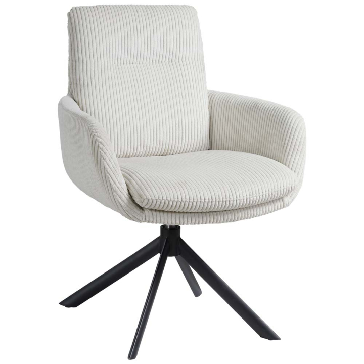 Прахово-боядисаната основа от метал, подчертана в черен цвят и комфортната, обширна седалка в бежова текстилна дамаска придават на стола приветлив вид.