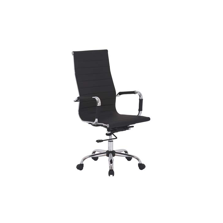 Очарователен, стилен и елегантен офис стол с размери Ш:54/Д:66/В:108-113.5 см. Използваните висококачествени материали за изработката на стола (еко кожа и хромиран метал), създават атмосфера на висок стандарт и класа в помещението. Със своята визия и функционалност офис столът е прекрасно обзавеждане за офиси, конферентни зали, търговски площи или дома. Столът притежава елегантна седалка и облегалка поставени на петлъчева хромирана основа с ТИЛТ механизъм (люлееща се седалка). Може да променя височината на седене с 5,5 см, да се върти на 360°, както и да се придвижа във всички посоки посредством пет двойни колелца за заемането на най-удобната работна позиция.