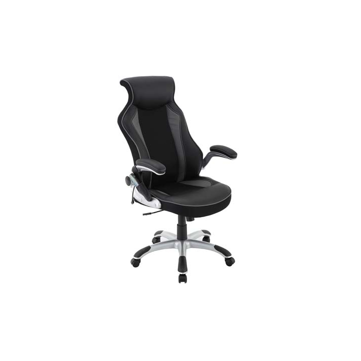 Офис стол с функция масаж с размери Ш:72/Д:70/В:117.5-125 см. Моделът разполага с удобна седалка и облегалка, стилно тапициран с висококачествена еко кожа в черно-сив цвят. При задействане на функция масаж седалката на модела масажира гърба на седящия в 4 точки, като по този начин може бързо и лесно да възстанови работоспособността си. Посредством дистанционно, може да включвате и изключвате масажната функция, която има няколко различни масажни програми. Моделът разполага с петлъчева основа на колелца с амортисьор, повдигащи се подлакътници, както и въртяща се седалка на 360°. Столът е с максимална товароносимост от 120 кг.