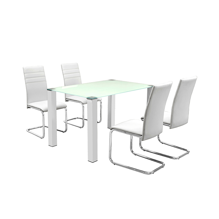 Създайте модерна и елегантна обстановка във вашата трапезария с този изискан комплект, включващ маса и четири стола. Масата впечатлява с плот от 8 мм закалено стъкло в бял лак, който придава усещане за лекота и стил, а белите ѝ крака внасят хармония и свежест в интериора. Столовете са тапицирани с висококачествена бяла еко кожа, осигуряваща едновременно комфорт и лесна поддръжка, докато хромираните им крака добавят модерен акцент и стабилност. Със своите изчистени линии и балансиран дизайн, комплектът е завършено решение за всяко съвременно жилище.