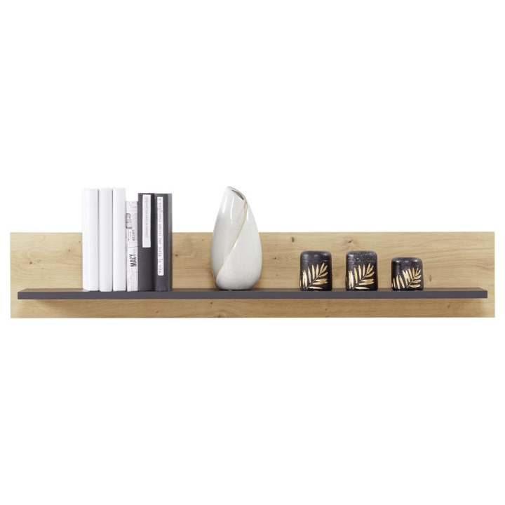 Полица с размери Ш:107/Д:22/В:19 см. Практично обзавеждане за съхранението и представянето на артефакти, книги, статуетки и други малки предмети. Състои се от стенен панел в два декора, светла дървесна текстура и черен цвят. Със своя изчистен дизайн полицата, може да бъде поставена навсякъде в дома.