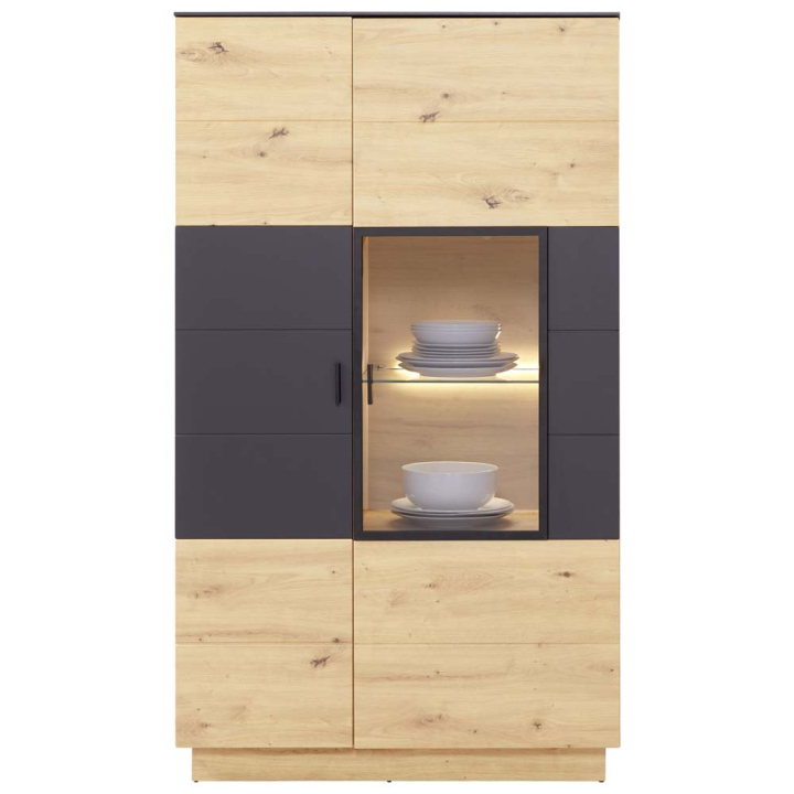 Витринен шкаф с размери Ш:94/Д:40/В:164 см. Моделът се състои от две отделения с врати на панти с мех. за безшумно затваряне, едната от които със стъклена витрина. В шкафа са монтирани пет рафта от ПДЧ и един рафт от закалено стъкло, като цялото вътрешно пространството е в дървесна декорация. Комбинацията от вътрешната дървесна текстура, стъклен рафт и стъклена витрина допринасят за уникалността на изделието. Корпусът на шкафа е произведен от ПДЧ с цокъл, а вратичките от MDF с красиви декоративни улеи. Продуктът е изключително подходящ за съхранението на домашни предмети в хола, като красивите артефакти, поставени зад витрината ще продължават да красят помещението надеждно съхранени.