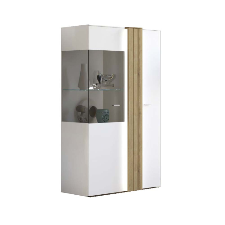 Ниска витрина с размери Ш:93.6/Д:44.8/В:152 см. Моделът е здрав и стабилен с корпус произведен от ПДЧ и врати от MDF. Продуктът ще ви впечатли със своята модерна визия и практично вътрешно разпределение за съхранението на малки домашни предмети и лични вещи. Разполага с две отделения с врати на панти с PVC дръжки с иноксов цвят, едната от които с монтирано стъкло, зад които са поставени седем рафта произведени от ПДЧ и един стъклен рафт. Артикулът е декориран в бял цвят, като единствено модула с LED осветление в средата на модела е с красива светла дървесна текстура (крайбрежен дъб).