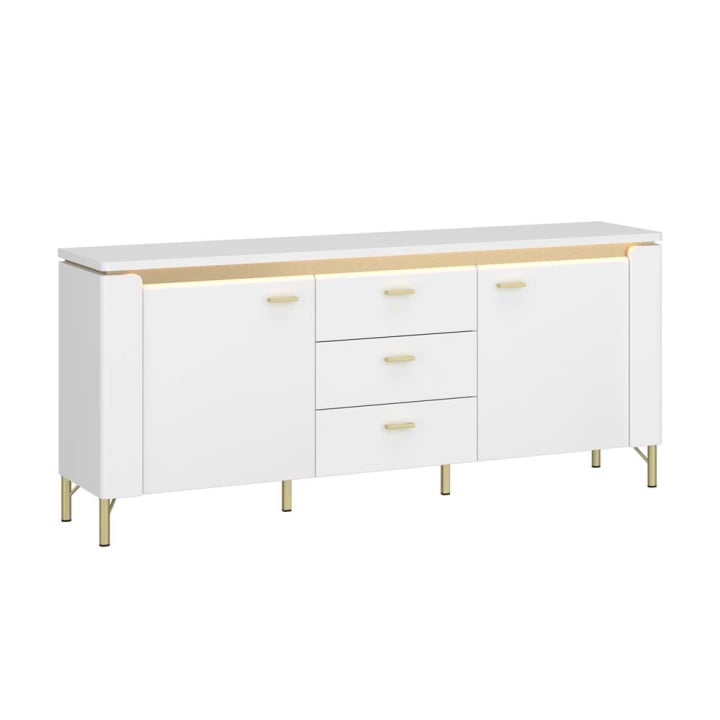 ТВ шкаф Лацио в бял гланц, съчетан със златисти детайли, 2 вратички и 3 чекмеджета, размери: 155.3/40/70 см