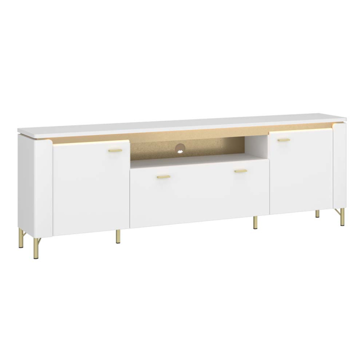 ТВ шкаф Лацио в съчетание от бял гланц със златисти детайли, с 2 вратички, 1 чекмедже и LED освеление, размери: 200.3/40/70 см