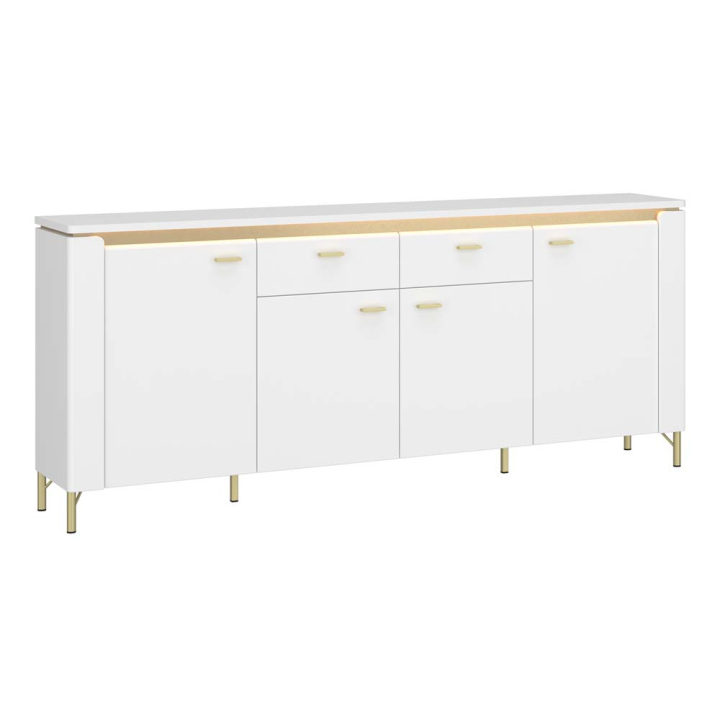 Комод Лацио в бял гланц с LED осветление, 4 врати и 2 чекмеджета, размери: 200,3/40/87,3 см