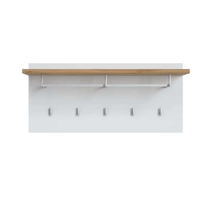 Пано закачалка с размери Ш:90/Д:30/В:40.5 см. Състои се от стенен панел с монтирани на него 1 горен рафт с лост за дрехи, както и 5 единични закачалки. Цветовата комбинация е удачна. Стенният панел е в бяло (алпийско бяло), закачалките и лоста за дрехи в сиво, а горният рафт в натурална дървесна шарка. Репродукцията е на дъб в светли тонове с откроени на места тъмни чворове представяща красотата и уникалната дървесна сърцевина на дървото. Вечно актуалната светла дървесна текстура, лесно вдъхновява, като без усилие доминира и създава усещане за уют в помещението. Бялото е символ на свобода, като комбиниран с дървесната текстурата на рафта с лекота добавя уют в помещението. Лесно може да се комбинира с мебели в други цветове и декори, но ви препоръчваме да го комбинирате с останалите мебели от серията.