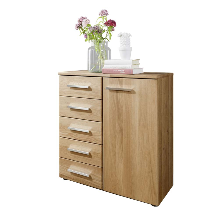 С компактни размери 80/36/86 см, комодът е декориран в светла дъбова текстура, която внася топлина и елегантност в интериора. Лявата му част е оборудвана с 5 просторни чекмеджета, подредени равномерно по цялата височина, които се отварят лесно благодарение на плавни релси и стилни сребристи дръжки. Дясната част разполага с отделение с врата на панти, зад която е монтиран вътрешен рафт, осигуряващ допълнително място за съхранение на дрехи, аксесоари или лични вещи.