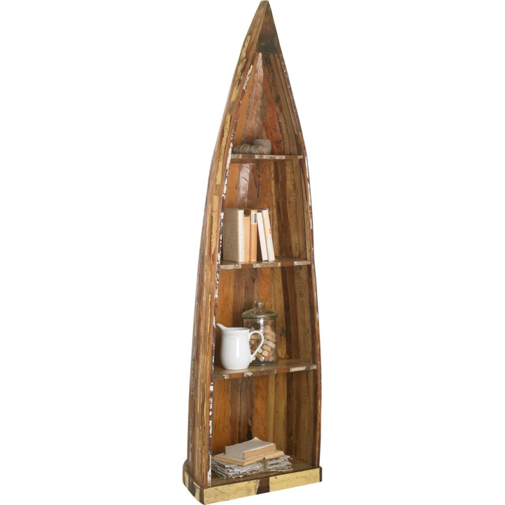 Уникална етажерка под формата на лодка с размери Ш:58/Д:45/В:205 см. Етажерката веднага ще ви впечатли със своята визия, произведена под формата на лодка с монтирани три рафта. Етажерката е произведена от масивна дървесина с ефект състарено дърво, чудесен избор за обзавеждане на помещения в бохемски стил, изби и др.