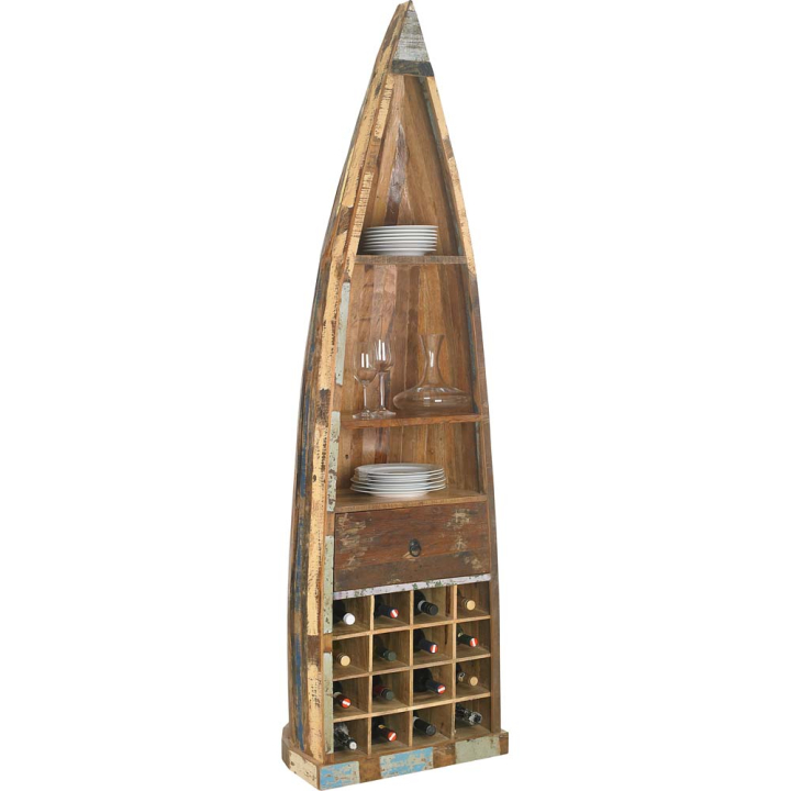 Уникална етажерка под формата на лодка с размери Ш:58/Д:45/В:205 см. Етажерката веднага ще ви впечатли със своята визия, произведена под формата на лодка с монтирани три рафта. Етажерката е произведена от масивна дървесина с ефект състарено дърво, чудесен избор за обзавеждане на помещения в бохемски стил, изби и др. Етажерката може да бъде поръчана и само с три рафта.