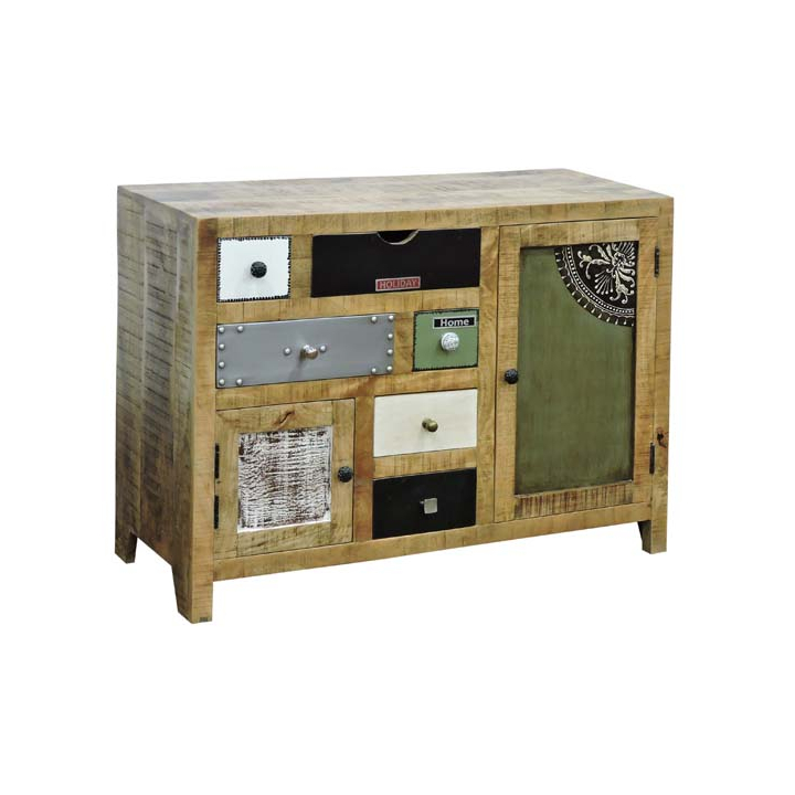 Винтидж комод произведен от мангово дърво с размери Ш:110/Д:40/В:80 см. Очарова с многоцветната си визия и красивата текстура на манговата дървесина. Комодът се състои от плот, 2 отделения с врати на панти, както и 6 чекмеджета с различна големина и тип дръжка. Запазили чара и емоцията на едно отминало време. Всеки елемент е уникален, като релефната текстура ще ви върне към времена, когато мебелите бяха несъвършени, но уникални. Този тип дизайн е изключително търсен, защото с лекота добавя към помещението визия и енергия за творчество и креатив. Текстурата на манговото дърво се доближава до триизмерния визуален ефект, заредена с много вътрешна топлина. Комодът е не само удивителен, но със сигурност ще издържи във времето на новите модни тенденции, като намери място и в най-модерните жилища. Освен с красива визия и функционално място за съхранение на предмети, комодът е изключително здрав. Мебелите произведени от мангово дърво се отличават с много голяма здравина и стабилност и дълъг експлоатационен живот.