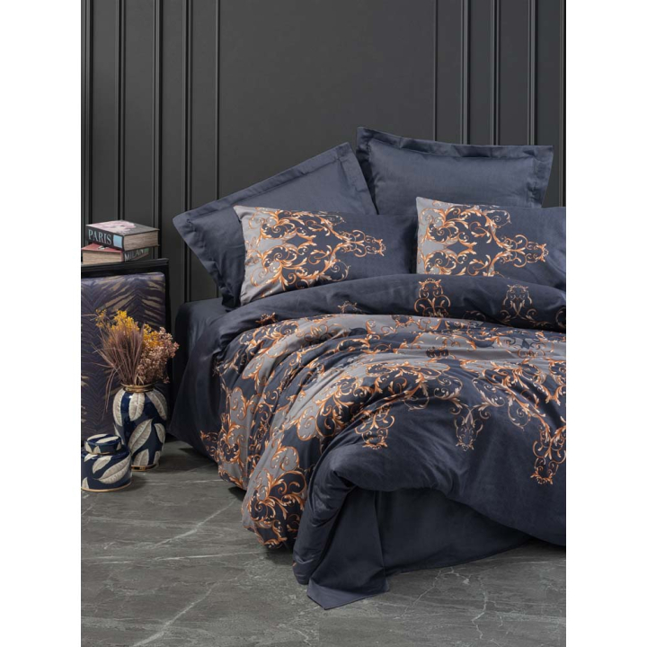 Подчертаният дизайн с класически мотиви е умело съчетан с модерно излъчване, търсено при обзавеждането на съвременния дом. Високият клас спално бельо придава на спалнята невероятно усещане за естетика и лукс. Комбинацията на двата цвята с универсален чар - сиво и синьо - само допълва характера на комплекта, като "облича" интериора с отличителен вкус.