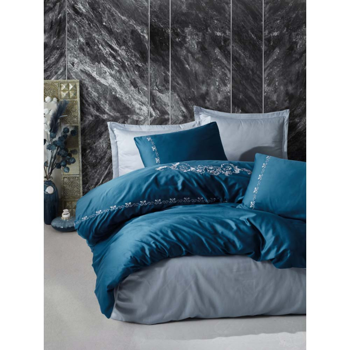 Луксозен спален комплект от 7 части с два плика, сатениран памук в комбинация от нюанси на синьо-зелено (петролено) с бродерия .