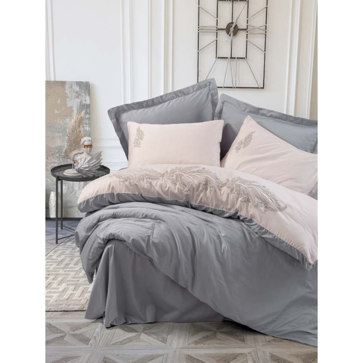 Изключително елегантно спално бельо, с висококачествена бродерия, адаптиращо се чудесно в стилната спалня! Текстилът е първокласен, с много добра технология на обработка и при правилна поддръжка, ще остане в първоначален вид дълготрайно. Комплектът е подходящ за поднасяне като ефектен и функционален подарък.
