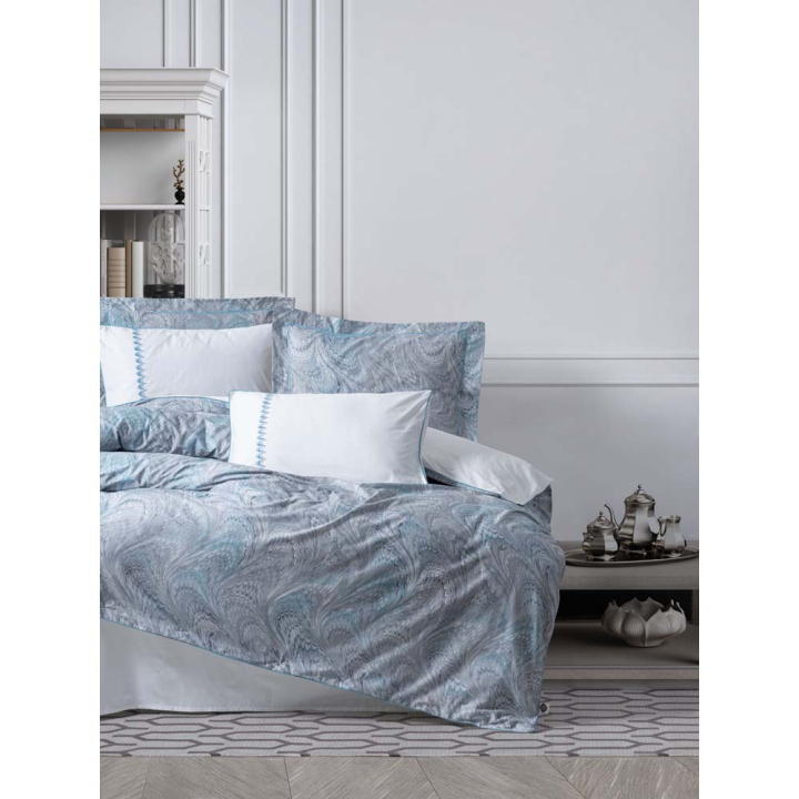 Луксозен спален комплект от 6 части с елегантни флорални мотиви в пастелно синьо - 100% сатениран памук от първокласна прежда