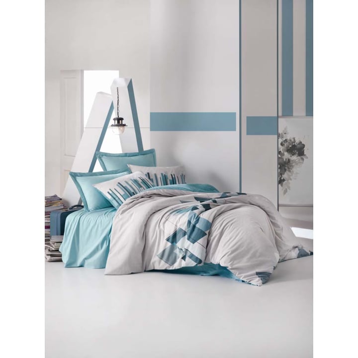Спален комплект от 4 части с геометрични мотиви в петрол и сиво, 100% памук ранфорс 144 ТС