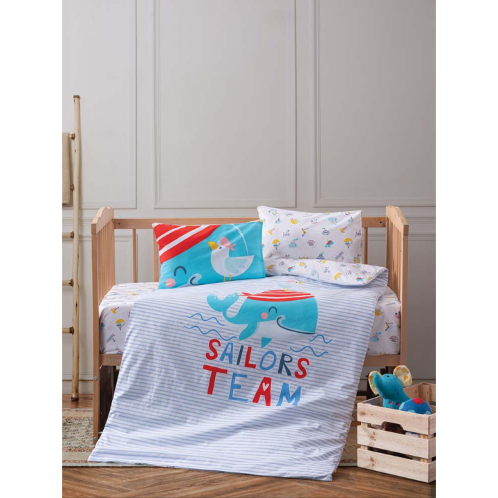 Бебешки спален комплект от 4 части - комбинация от бяло, синьо и червено.