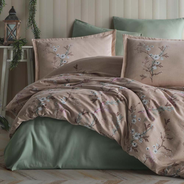 Спален комплект от 4 части с елегантни флорални мотиви в бежово и зелено, 100% сатениран памук