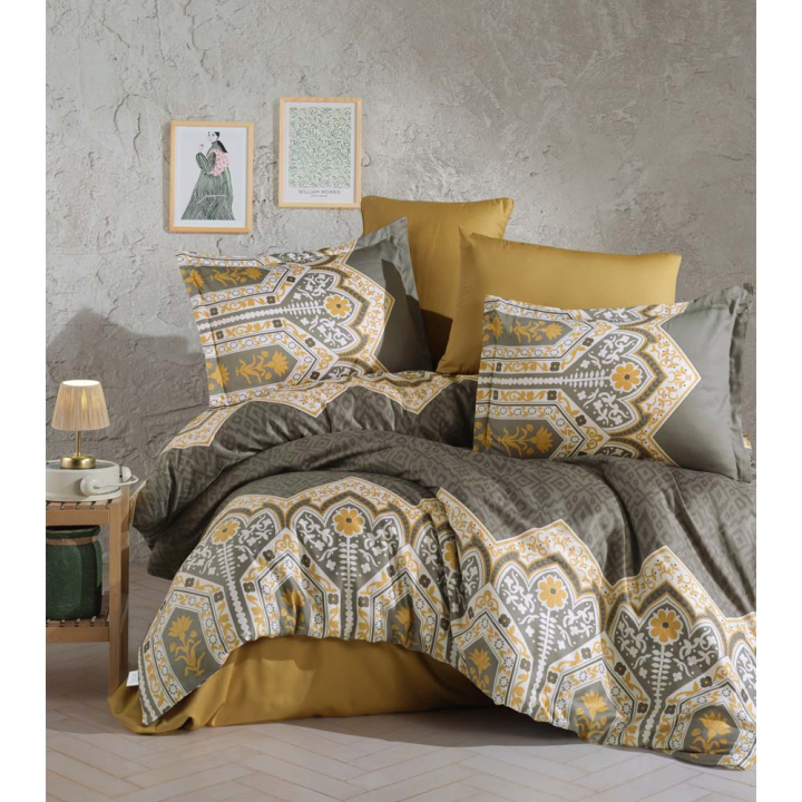 Спален комплект от 5 части в сиво и жълто с елегантни барокови мотиви, 100% сатениран памук