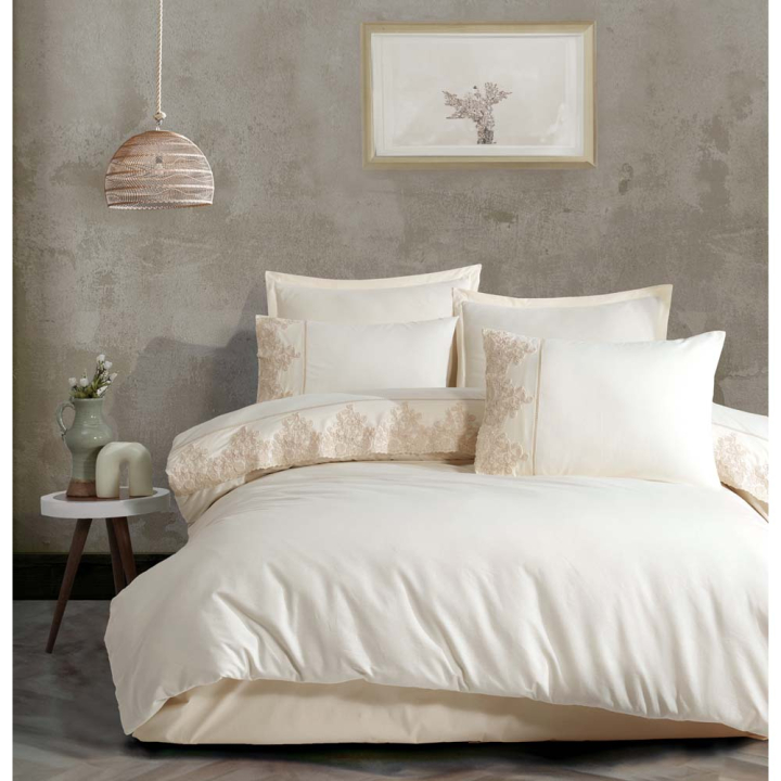 Спален комплект от 4 части в бежов цвят (крем) с елегантна бродерия, 100% памук ранфорс