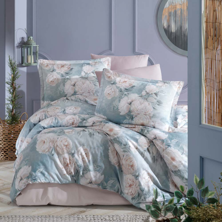 Дизайнът на комплекта излъчва мекота и комфорт. Сънят е по-спокоен и настроението е уютно. Нежните цветя изпъкват на синия фон и придават романтика на цялата спалня. А материята е изключително приятна на допир и умело регулира температурата по време на сън.