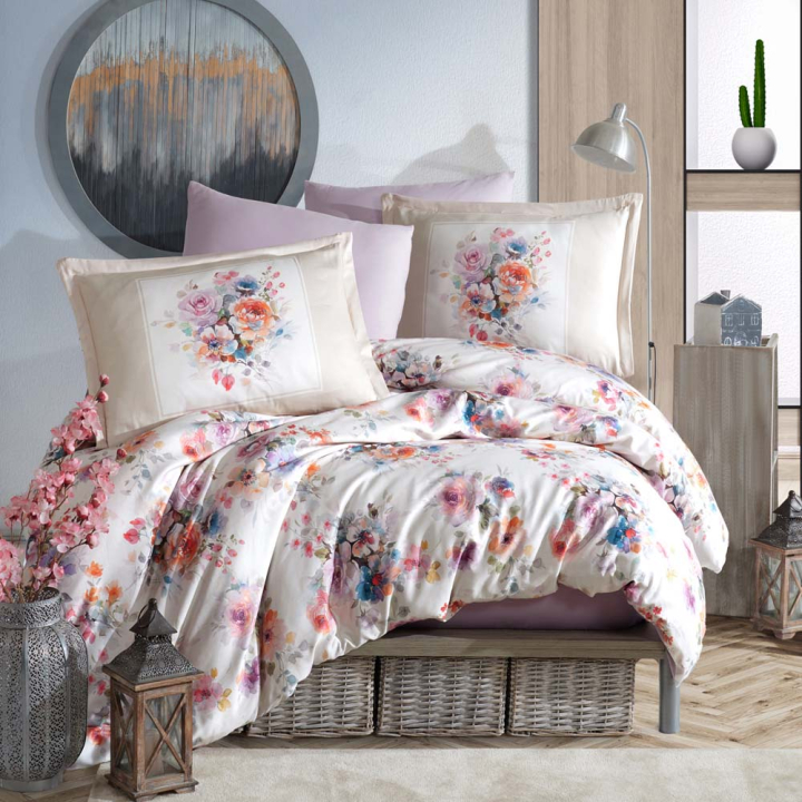 Нежен спален комплект от 5 части с пъстри цветя, 100% сатениран памук
