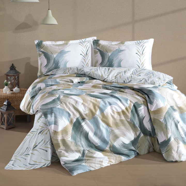 Сякаш боядисван с четка в три цвята, комплектът е изключително деликатен и носи комфорт и уют в спалнята. Вписва се във всеки интериор, а материята е изключително приятна на допир и умело регулира температурата по време на сън.