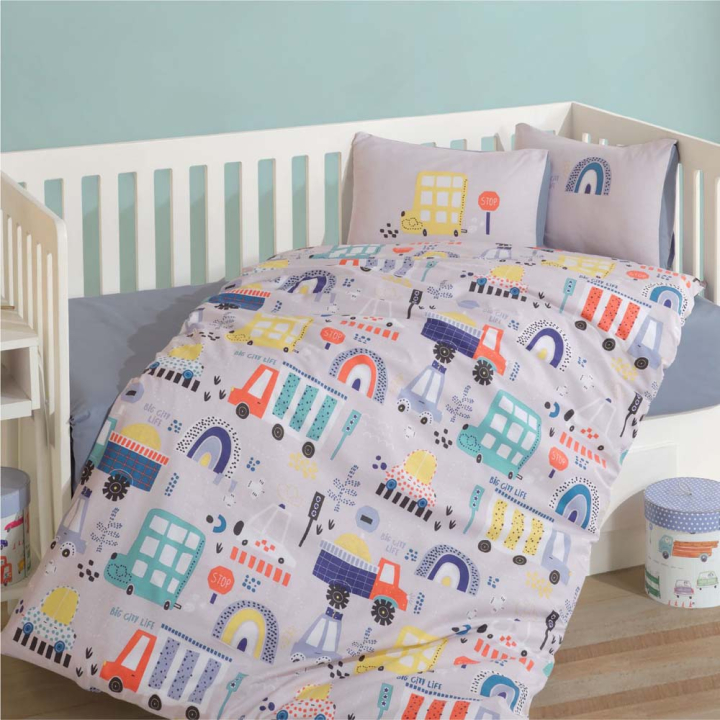 Комплектът е с игрив и весел дизайн, който внася настроение и усмивки в детската стая. Мъникът ще се радва на спокоенсън и уют, благодарение на естественатаматерия, която е с висока плътност и е мека и нежна към бебешката кожа, без да причинява алергии или зачервявания. Комплектът е с високо качество и гаранция за запазване на първоначалния вид, дори след многократно изпиране.