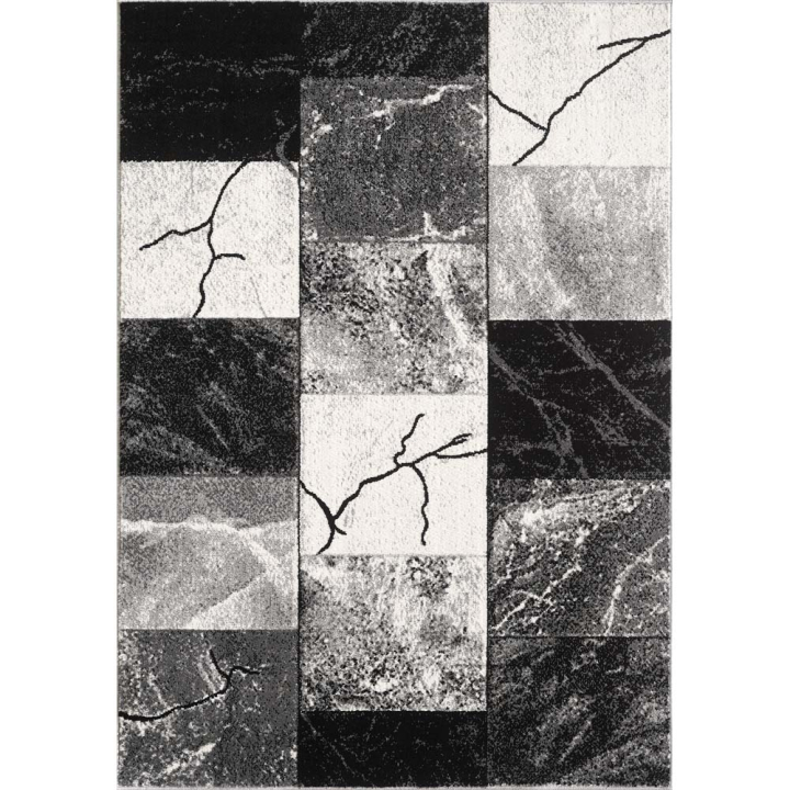 Килимът се отличава с изискан съвременен дизайн, подреден в геометрични форми с ефект на мраморна текстура. Черните линии придават усещане за дълбочина и артистичност. Комбинацията от контрастни нюанси създава елегантна визия, подходяща за всеки интериор. Килимът е чудесен акцент за всекидневна, спалня или офис, като добавя усещане за стил, уют и визуален баланс.