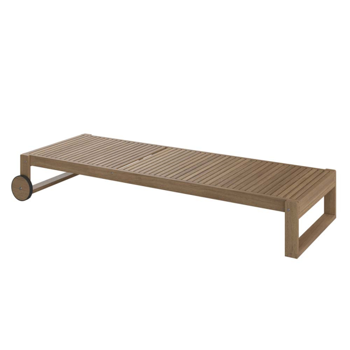 Градински шезлонг с конструкция от акациева дървесина, две колела в задната част и функция за регулиране на облегалката