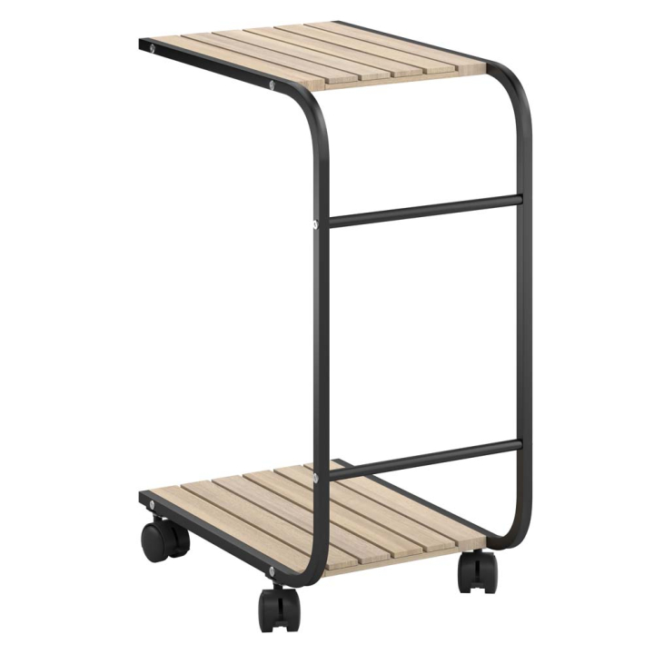 Градинска помощна масичка с конструкция от стомана, два плота от акациева дървесина и 4 колелца за мобилност, 30/46/65 см