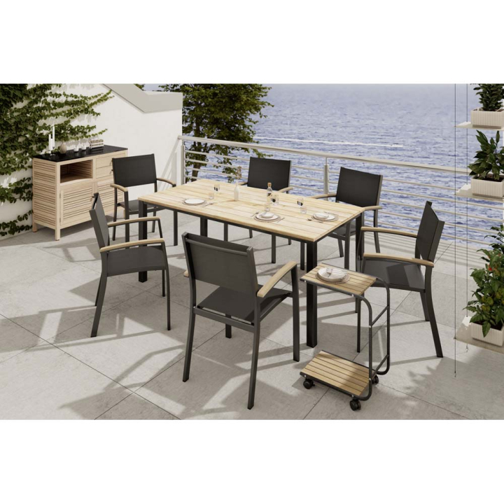 Голямата трапезна маса предлага стабилна алуминиева конструкция, достатъчно място за вашите летни храни, напитки, свещи и декорации, плюс натурално присъствие чрез топлата акациева дървесина. Комбинирайте с помощна масичка на колелца, комплект столове, допълнете с един-два шезлонга и се отдайте на лятото!