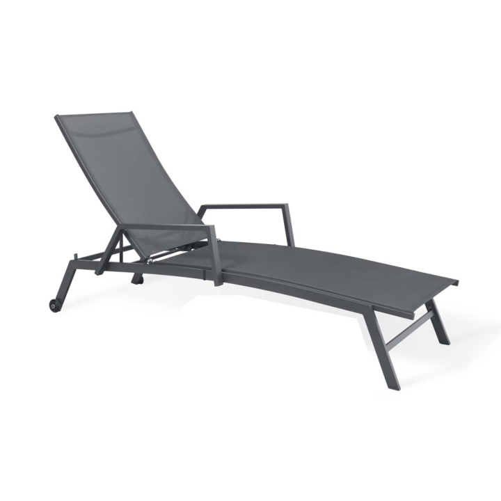 Градинският шезлонг в модерен антрацит предоставя удобство и красива визия. Елегантната метална конструкция осигурява нужната стабилност, а двете малки колелца идват на помощ за едно бързо преместване под новата сянка, без особени усилия. Функциите на облегалката позволяват допълнителен комфорт според настроението, а двата подлакътника завършават желанието да се отпуснете спокойно. Висококачественият PVC текстил е изключително лесен за поддръжка, устойчив на ултравиолетови лъчи и непромокаем, благодарение на промазаната си повърхност.