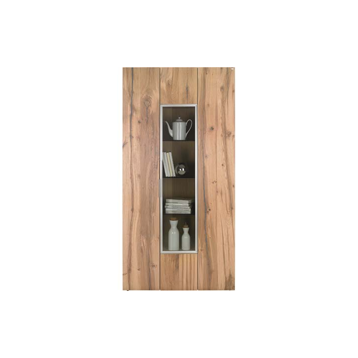 Този дизайнерски витринен шкаф е изработен от масивен дъб, съчетавайки естетика във визията си и практичност. С внимание към детайла и висококачествени материали, той предлага дълготрайна употреба.