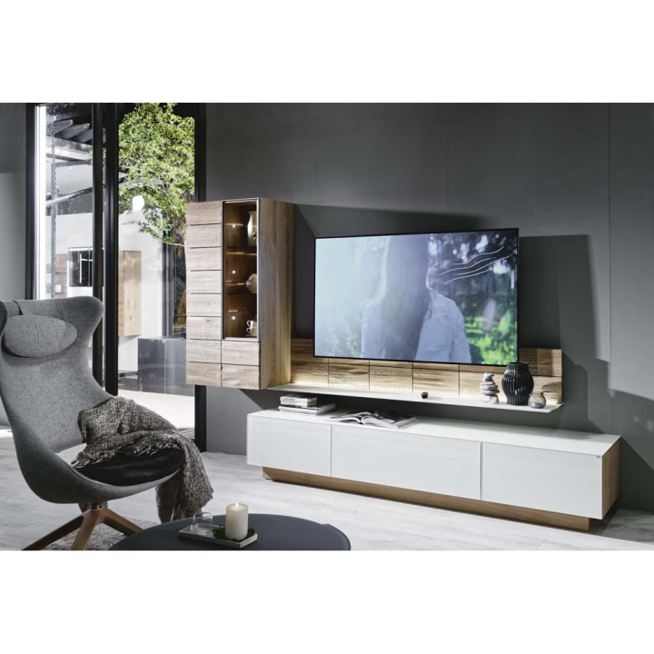 Вдъхнете стил и функционалност на вашия хол с изискана секция "Ви-Монтанара". Тази впечатляваща конфигурация комбинира натуралната топлина на масивния див дъб с елегантността на бяло стъкло optiwhite.