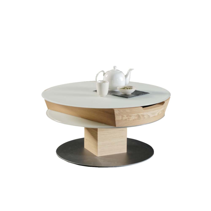 Масата е изработена с плот от закалено бяло стъкло и метална основа, а централната основна част е създадена от масив - див дъб.