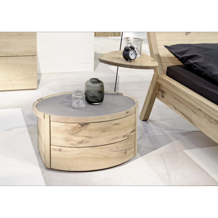Модерно нощно шкафче с чекмеджета с размери Ш:65/Д:43/В:33 см. Веднага ще ви направи впечатление нестандартната и атрактивна форма на шкафчето. Произведено е от фурнир, масив (дъб) със стилен съвременен дизайн и стабилна овална конструкция състояща се от плот със стъкло и две чекмеджета с плавно затваряне. Притежава съвременна визия, комбинираща красотата на дъба и блясъка на стъклото. Текстурата на дървесината е специално третирана, моделирана в естествени натурални шарки с откроени чворове и дървесни пукнатини. Някой от елементите на модела са ръчно изработени, като всеки детайл носи индивидуална структура, визия и тоналност, което прави продукта не само уникален, но и изключително качествен.