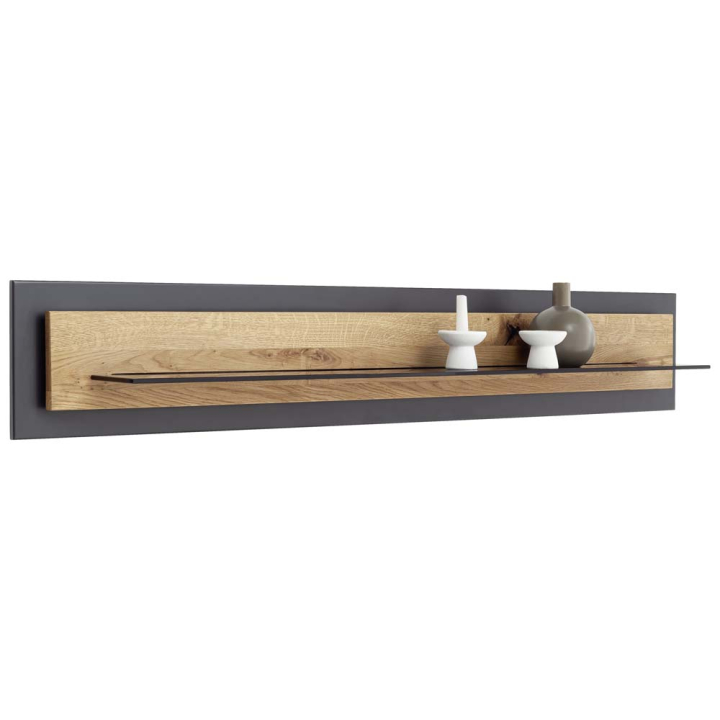 Добавете стилен акцент към дома си с тази елегантна стенна полица, съчетаваща естествената красота на дъбовата дървесина и изтънчения вид на антрацитното закалено стъкло. Тя е създадена с внимание към детайла и предлага категорична устойчивост, и издръжливост.